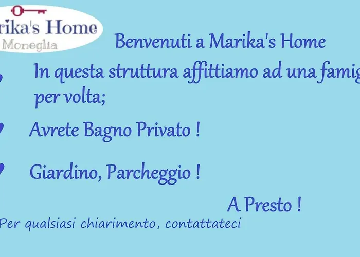 Moneglia városi Marika'S Home szobákat kínál erkéllyel és étkező területtel, továbbá vasalóval, vasalódeszkával, valamint Wi-Fi-vel és síkképernyős műholdas TV-vel. A tea- és kávéfőző berendezéssel felszerelt szobákban kanapét szintén kínálnak. A fürdőszobákban bidé, külön WC és zuhanyzó, továbbá hajszárító és törölközők is rendelkezésre állnak.